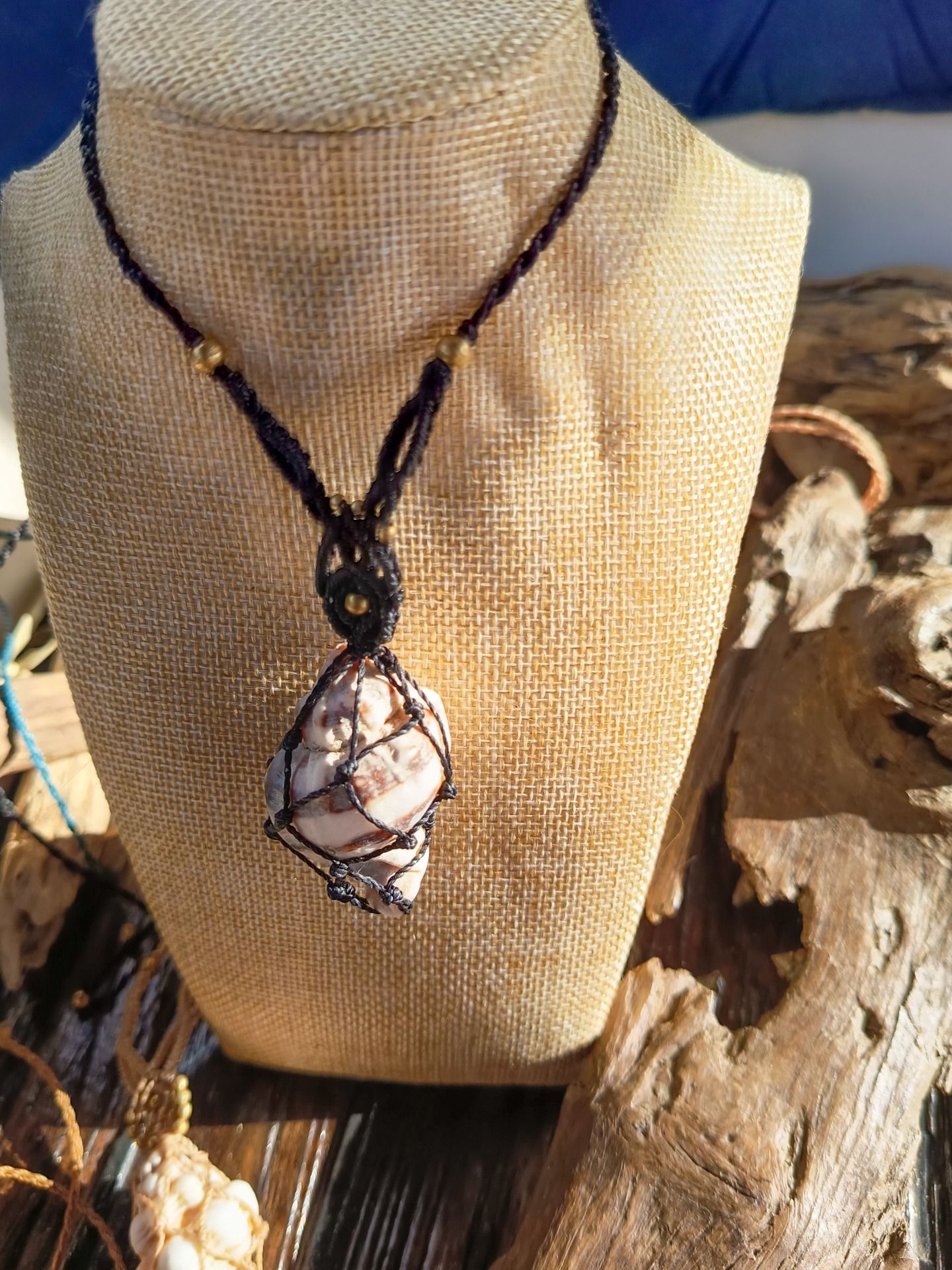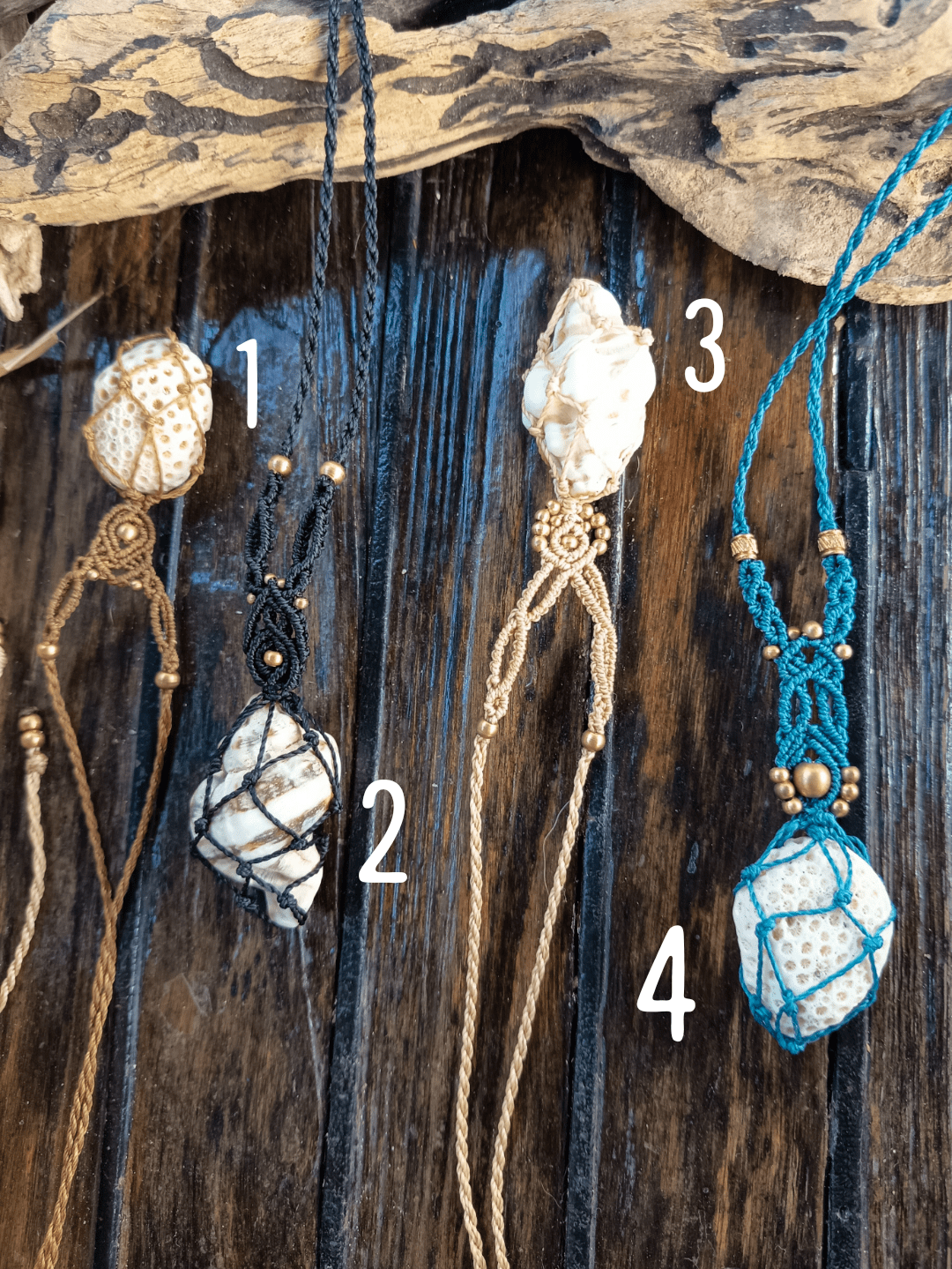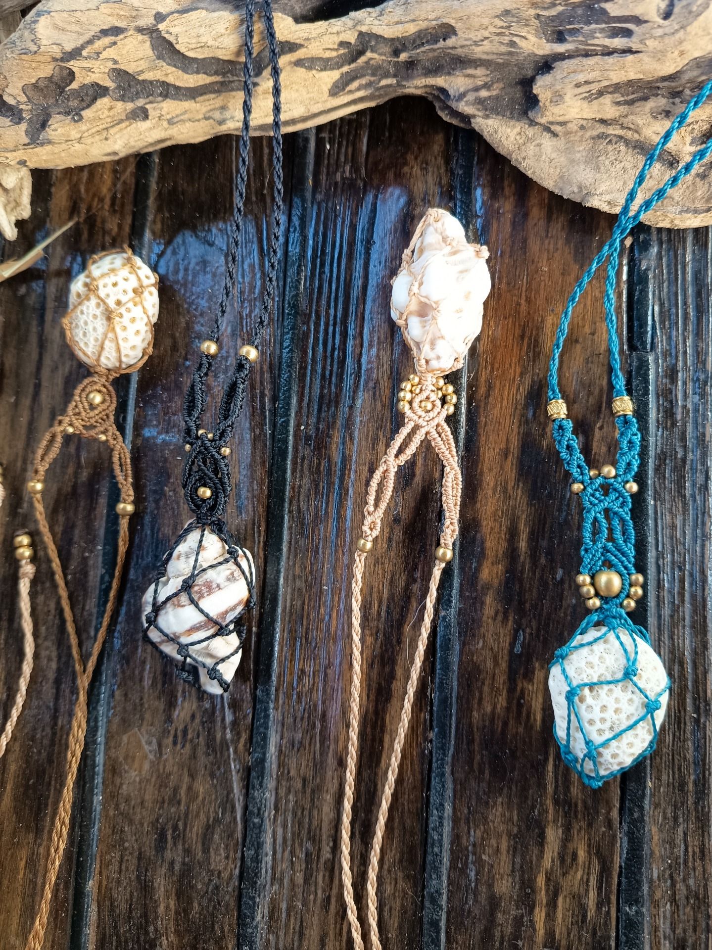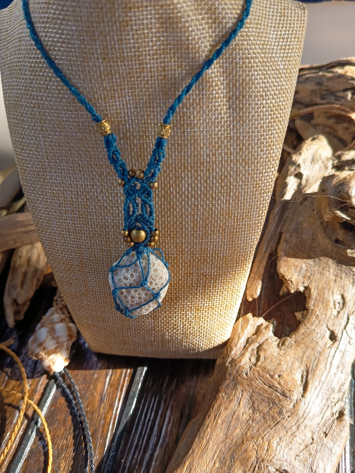 Joli pendentif en Macramé. Avec des Perles et des apprêts en laiton doré. et de coquillages et du corail ramassés sur la plage