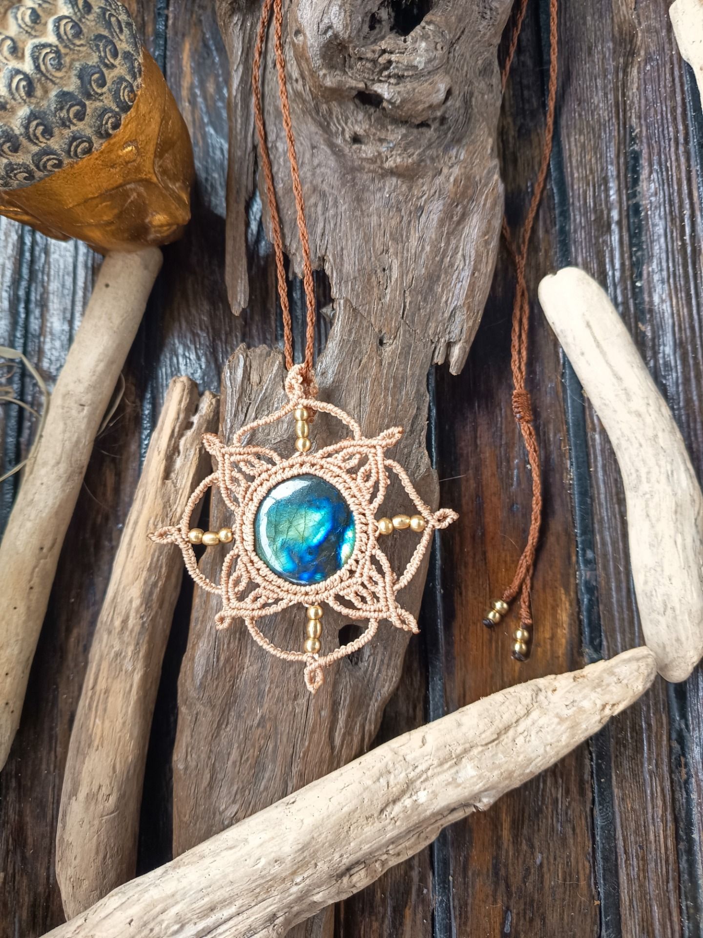 Joli pendentif en Macramé. Avec des Perles et des apprêts en laiton doré. et une belle labradorite ronde.