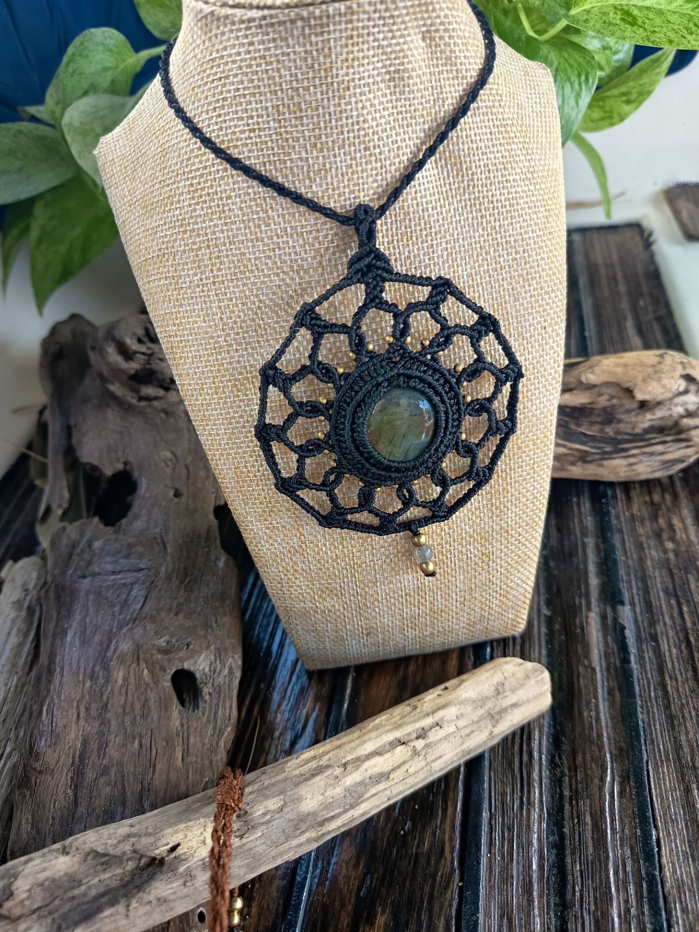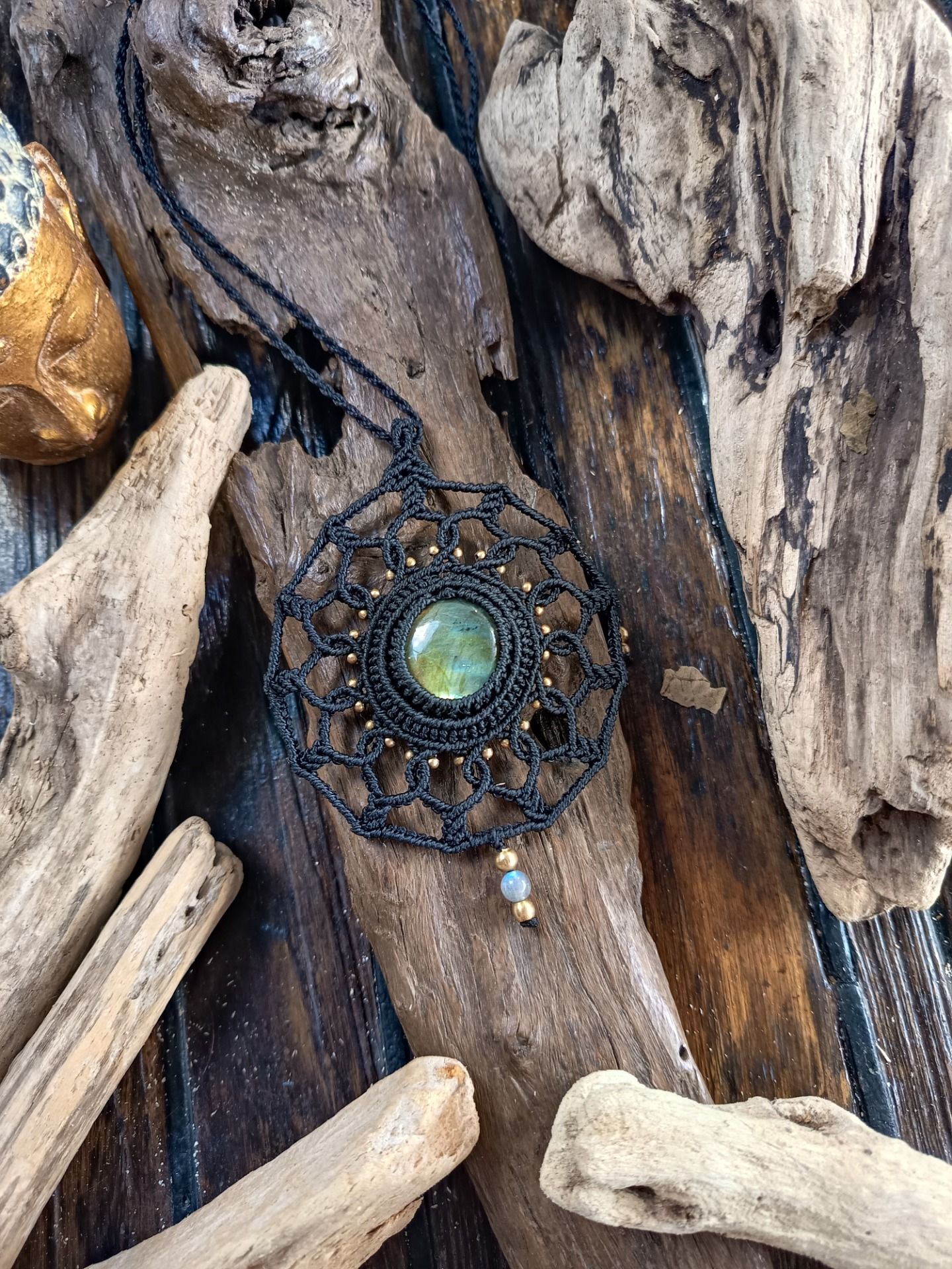 Joli pendenti mandala en Macramé. Avec des Perles et des apprêts en laiton doré. Et sa belle labradorite ronde.