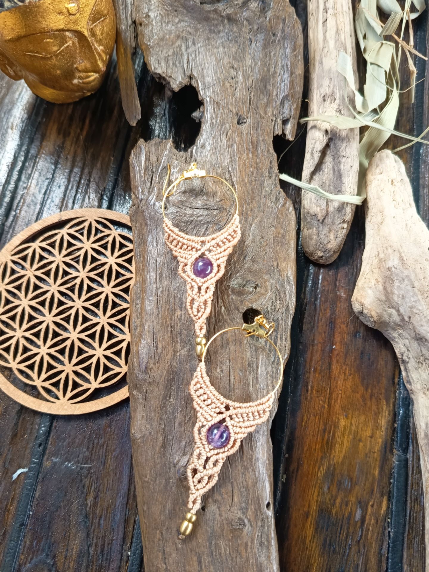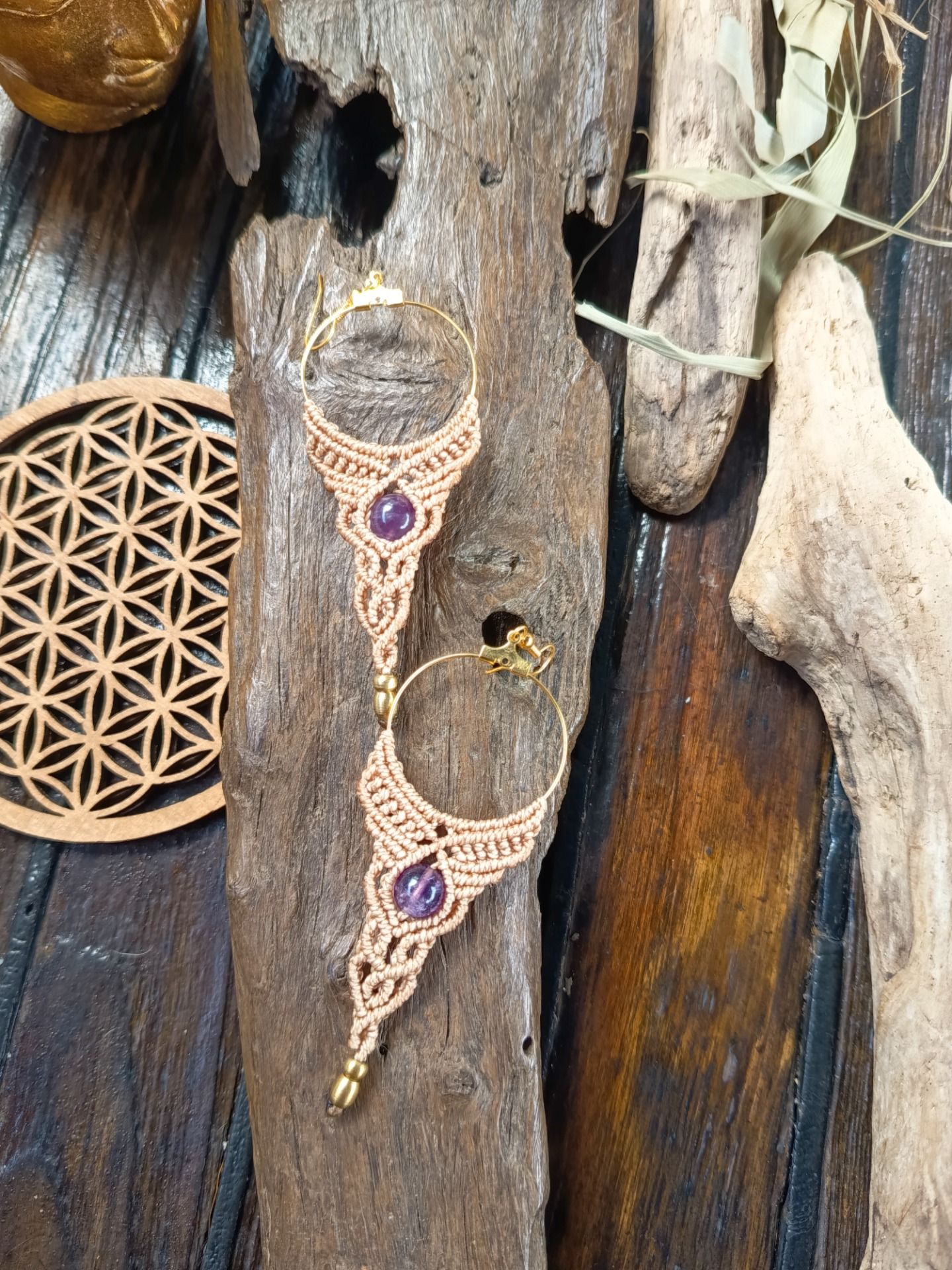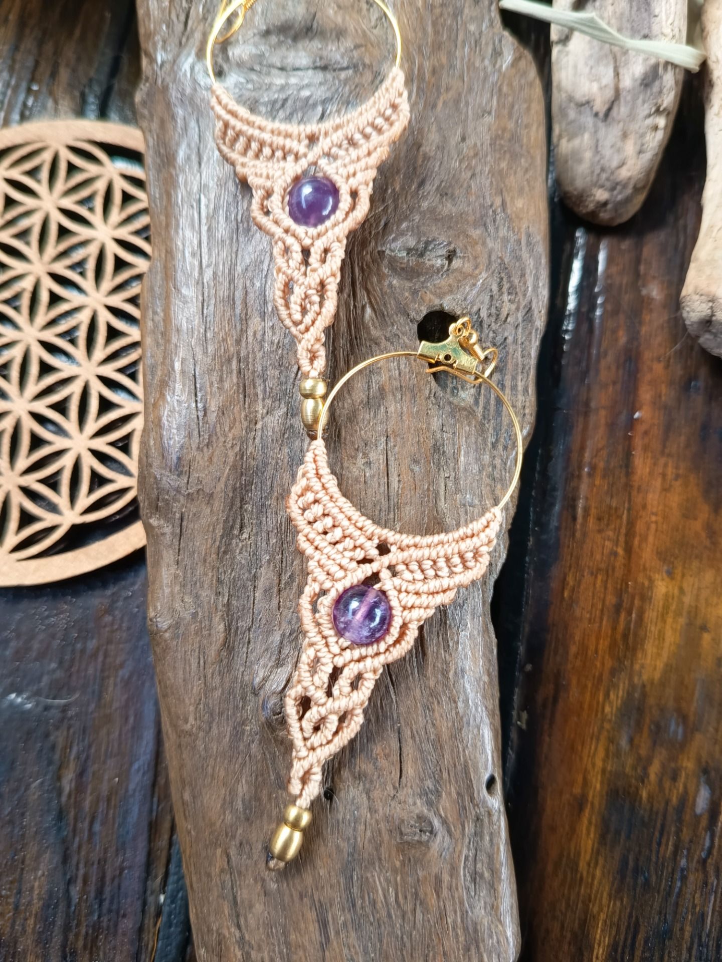 Jolie pire de boucle d'oreille en Macramé. Avec des Perles et des apprêts en laiton doré. et des perles en améthystes.